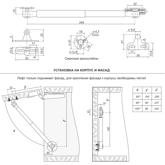 GL104 поставляется в комплекте с тремя кронштейнами — для крепления к боковой стенке корпуса, для крепления к фасаду из плитных материалов (ЛДСП/МДФ) и к фасаду из алюминиевого профиля.