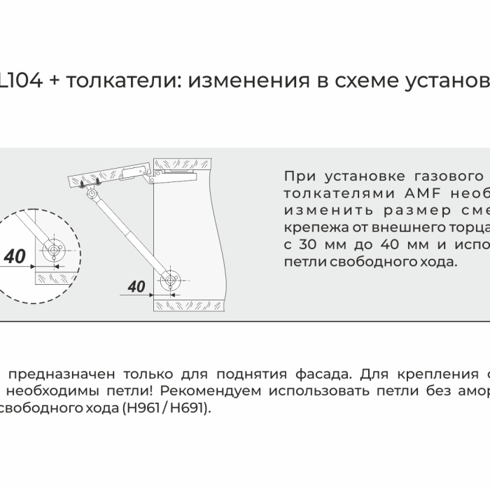 Для открытия от нажатия рекомендуется установка с толкателем (на выбор с AMF 10 по AMF15) и петлями Н961 или Н691. При таком варианте схема монтажа поменяется, необходимо изменить размер смещения крепежа с 30 до 40 мм. Эти изменения отражены в схеме в карусели фото карточки.