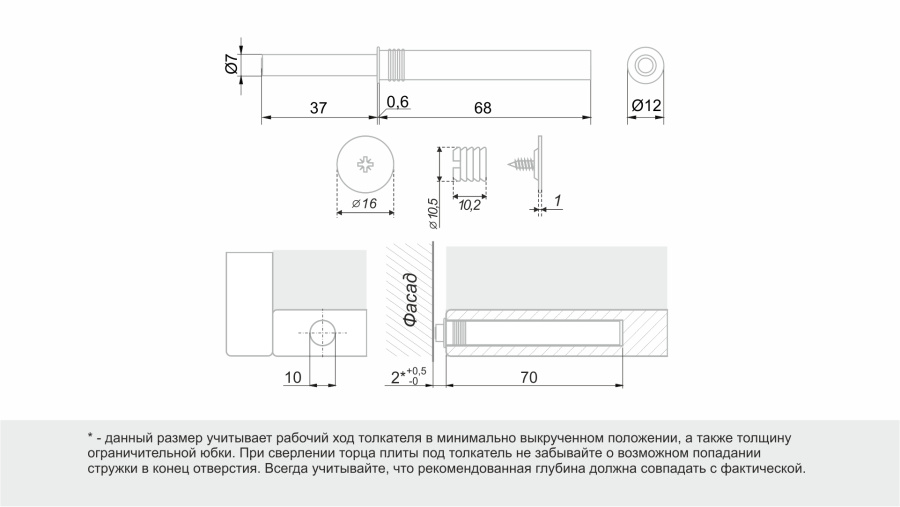 AMF15 – магнитный толкатель для врезного и накладного монтажа для установки на распашные фасады, фасады с открыванием вверх и фасады с открыванием вниз в рамках создания мебели с открытием от нажатия. Модель подходит для установки с любыми петлями без амортизатора, петлями без пружины и с обратной пружиной. Сильная пружина толкателя позволяет выталкивать даже тяжелые и крупные фасады минимум на 37 мм. Модель имеет регулировку расстояния зазора между наконечником толкателя и фасадом в закрытом положении +5 мм. Для установки данной модели накладным способом, необходимо использовать пластиковый корпус AMF16 аналогичного цвета, который приобретается отдельно. В комплекте с толкателем: ответная стальная планка и футорка. В комплектацию с 239 заказа дополнительно входит самоклеящаяся ответная планка размером 20х20х0,6 мм с клеевым слоем размером 17х17х0,45 мм для монтажа без необходимости сверления отверстий в фасаде.