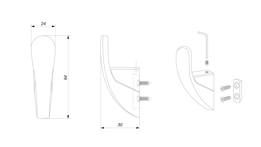 В комплект входит: крючок, крепёжная планка, саморезы 4х18 (2 шт.), крепёжный винт (1 шт.), шестигранный ключ. Рекомендуемая установка на плиту толщиной 16 мм.
