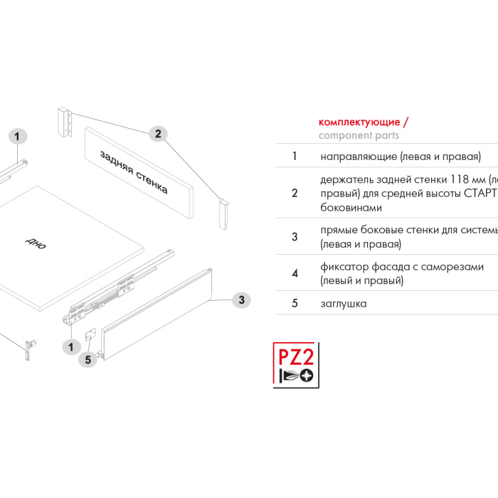 СТАРТ SOFT SB19 — комплект систем выдвижения для сборки выдвижного мебельного ящика с прямыми боковинами средней высоты 118 мм для минимальной высоты проёма 147 мм.